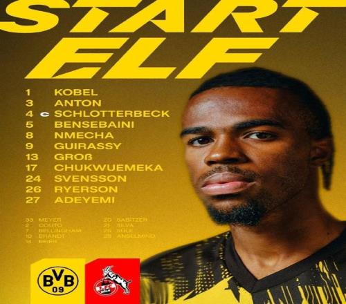 北京时间10月26日00:30,德甲 第8轮,多特蒙德主场迎战科隆,赛前双方球队首发名单公布如下: