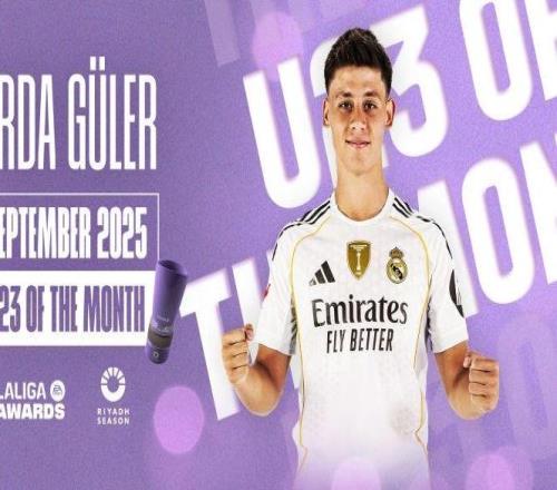 雷速体育9月30日宣 西甲官方发布公告,皇马球员阿尔达·居莱尔被评选为西甲九月份最佳U23球员。西甲官方表示,居莱尔已成为哈维·阿隆索的皇马队中关键一员,本月他用数场精彩表