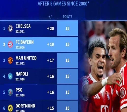 5胜+净胜19球,拜仁取得本世纪五大联赛前五轮第二好开局