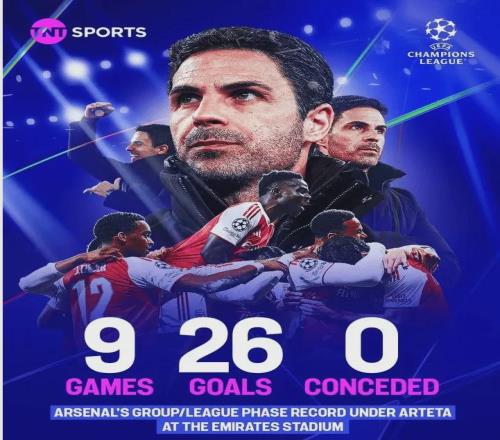 欧冠联赛阶段第三轮,阿森纳主场4-0大胜马德里竞技,据统计,在阿尔特塔治下,阿森纳欧冠非淘汰赛阶段主场9场全胜,总比分为27-0。据统计,在阿尔特塔治下,阿森纳在酋长球场进行了9场欧